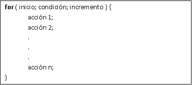NOTA: El contador del for puede estar declarado dentro de él mismo, en este caso el contador se considera como variable local al for, siendo inaccesible fuera de él. Por lo tanto, dos o más for no anidados, pueden declarar contadores con el mismo nombre.